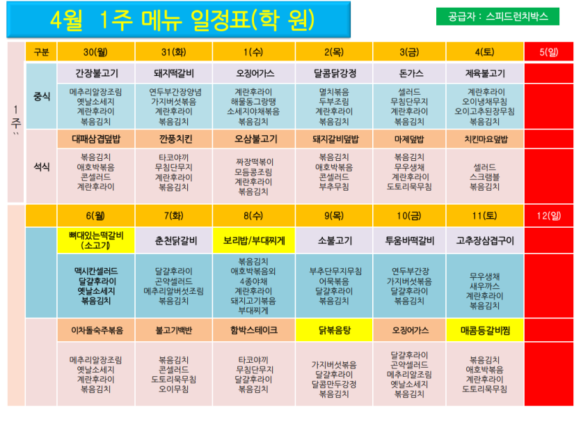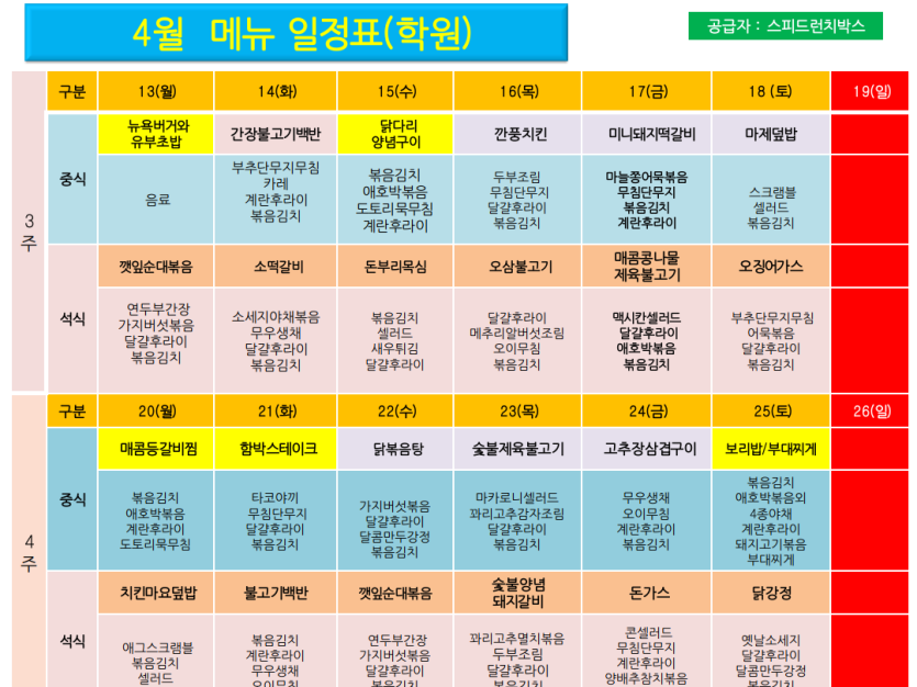 4월 학원용 도시락 메뉴입니다