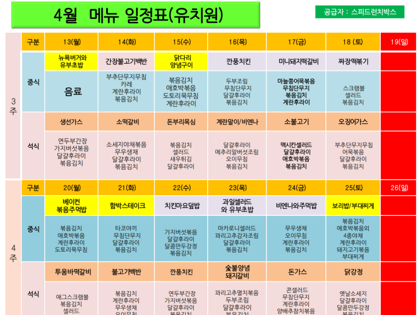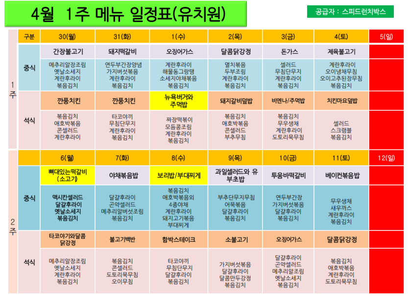 4월 유치원생 메뉴입니다